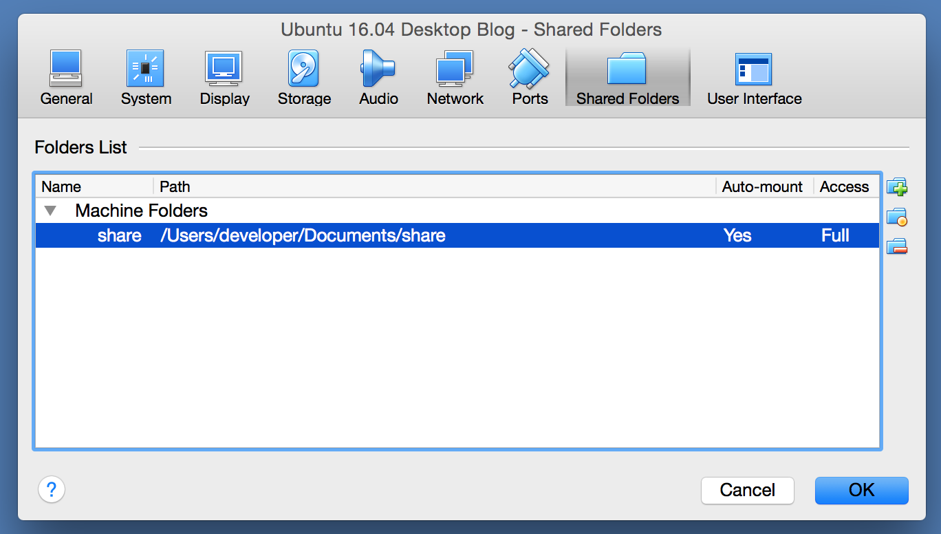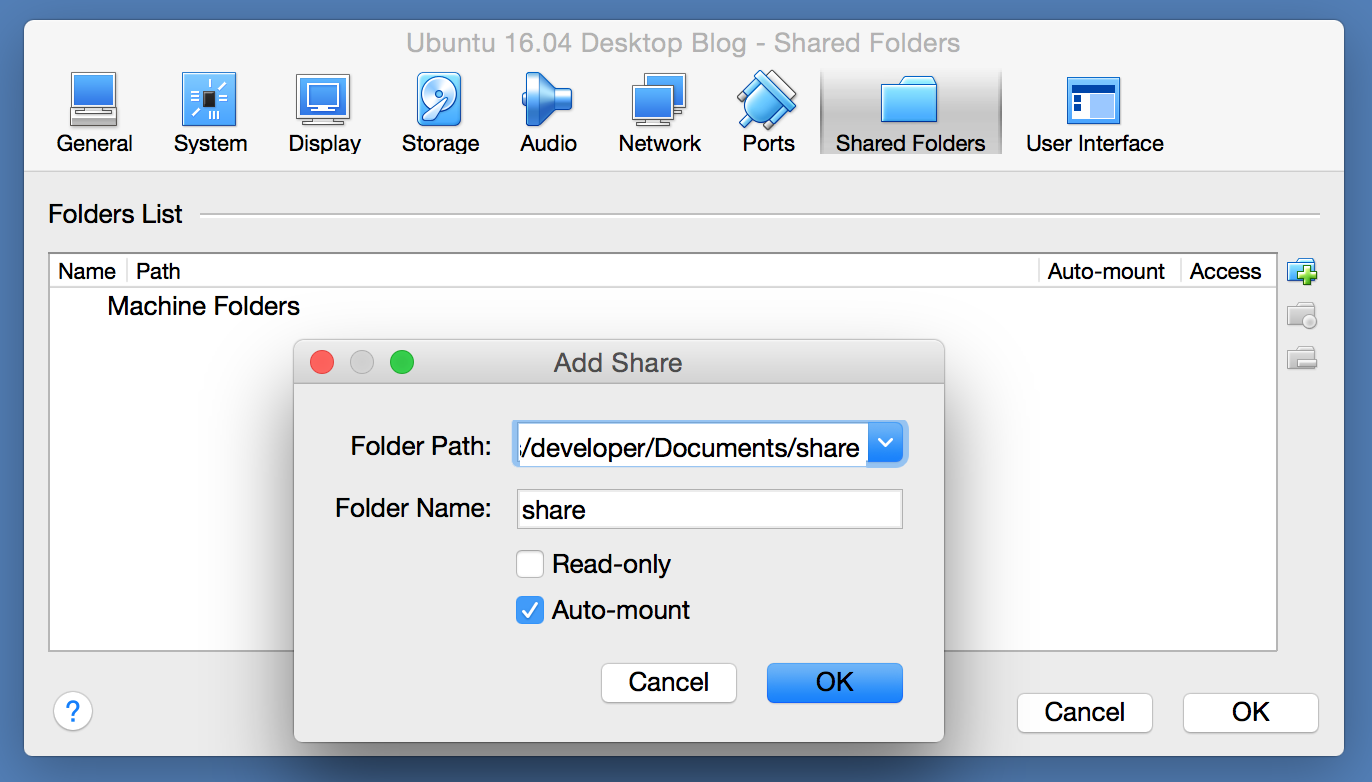 Create a folder on the host operating system that will be shared between it and the guest operating system. I named mine share and it is located at /Users/developer/Documents/share
