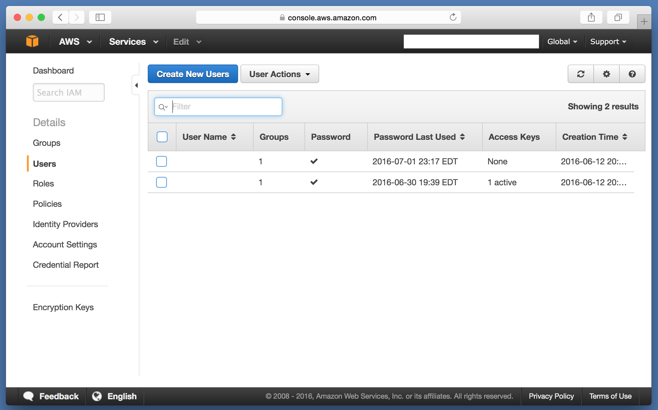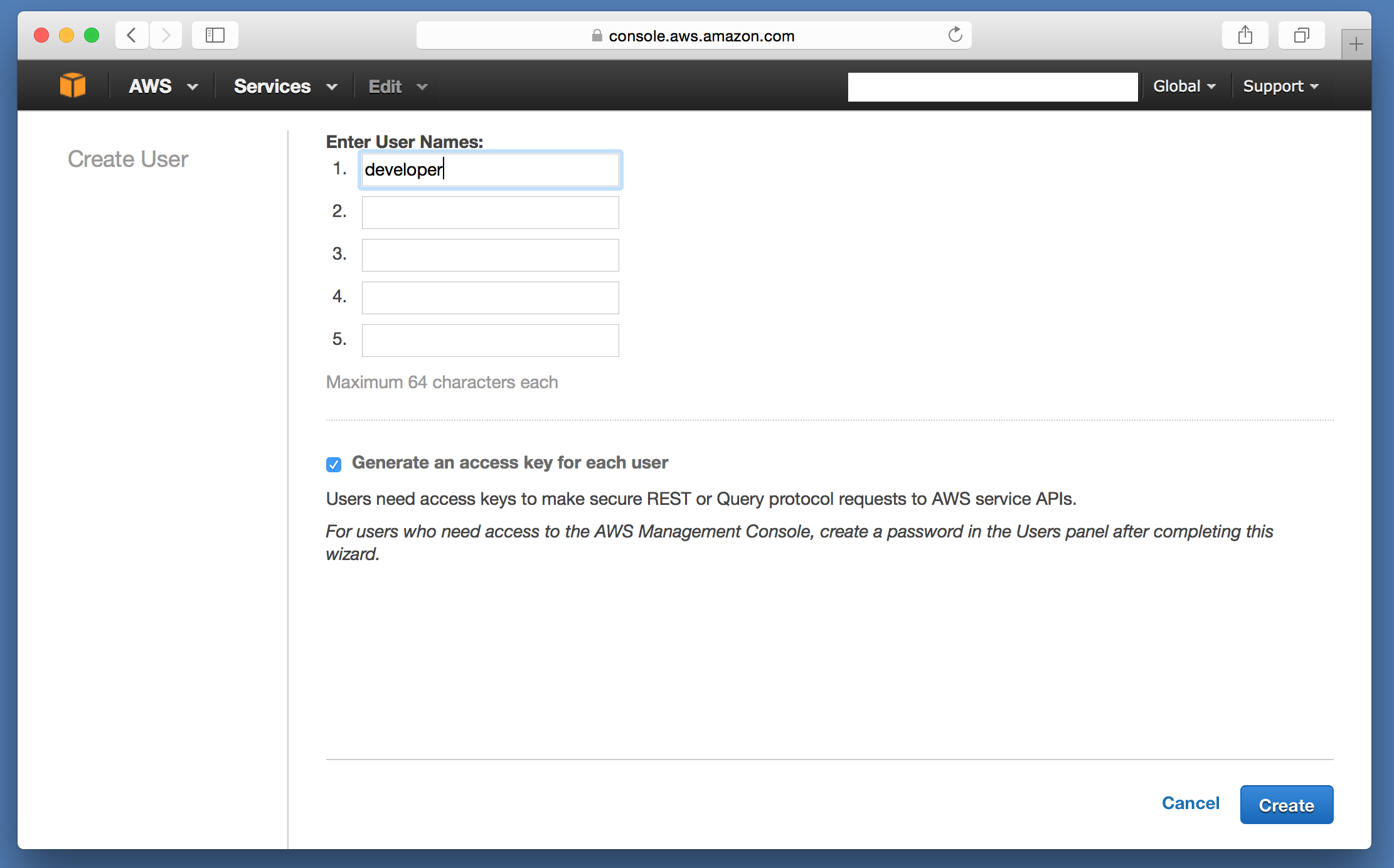 Hit Create New Users button, provide new user’s name and keep Generate an access key for each user checked.