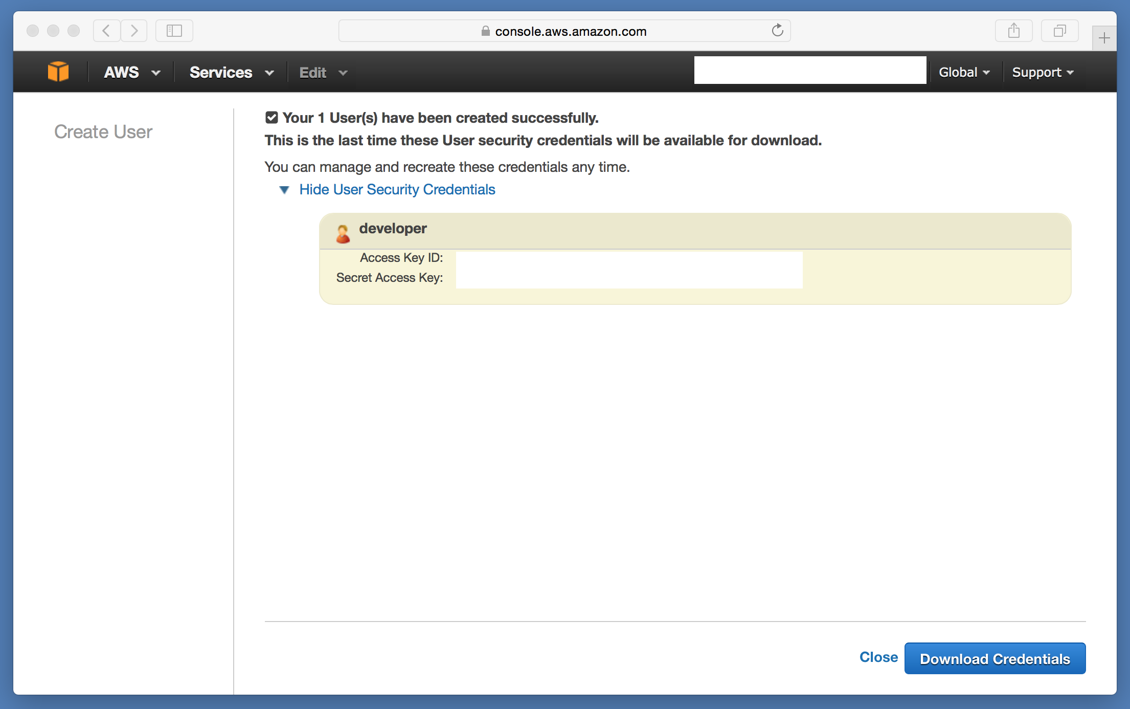 Hit Create button, then on Show User Security Credentials. Copy Access Key ID and Secret Access Key to clipboard or alternatively hit Download Credentials button and save the file with credentials in the folder that is shared with VM that Ubuntu is running on.