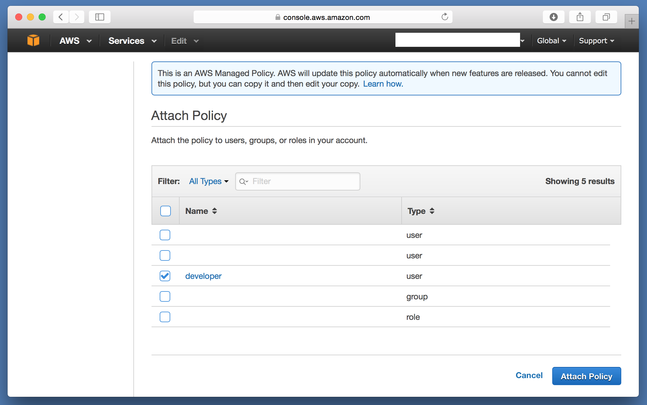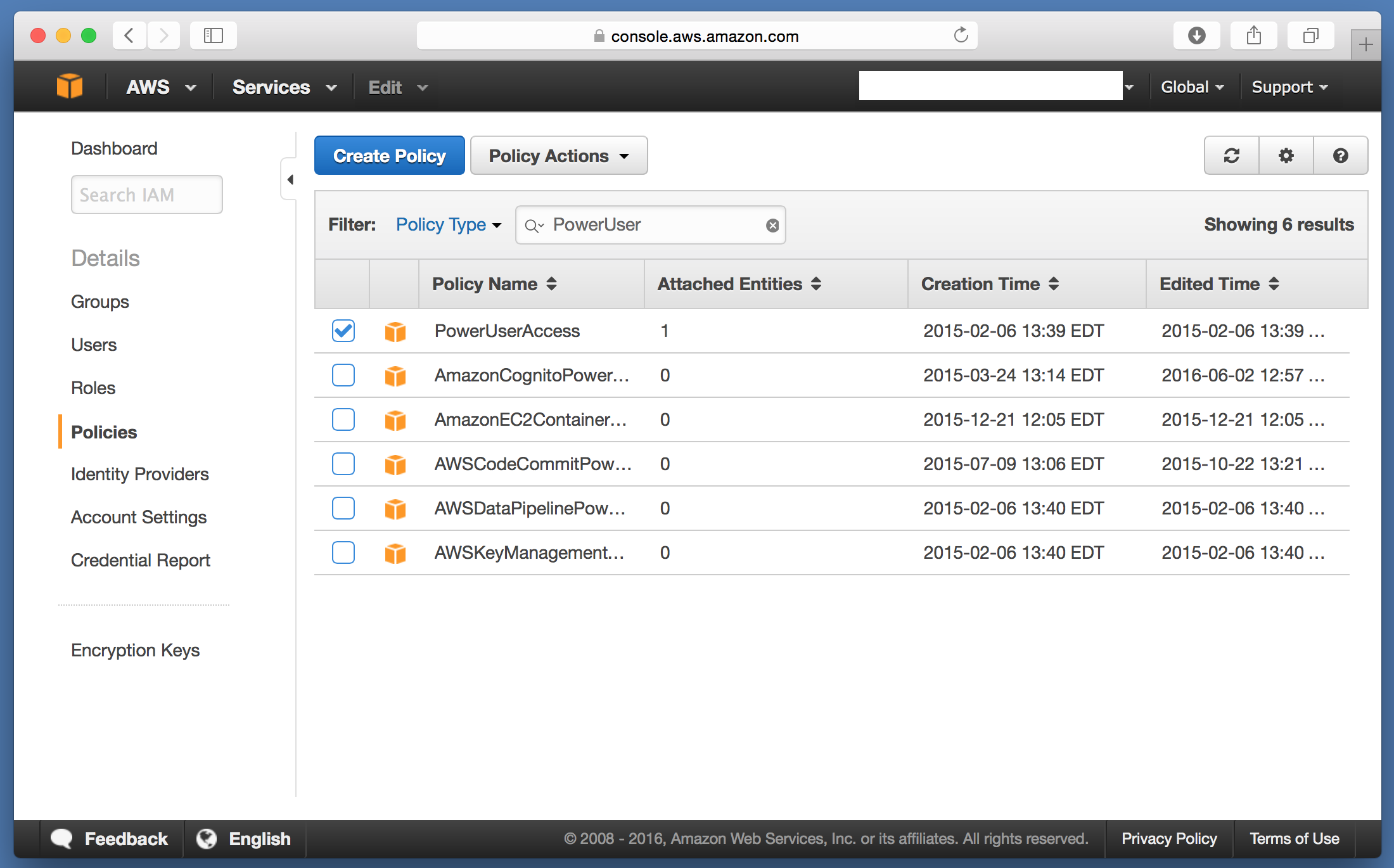 Click Policies link on the left pane, in Filter type “PowerUser” and check PowerUserAccess policy