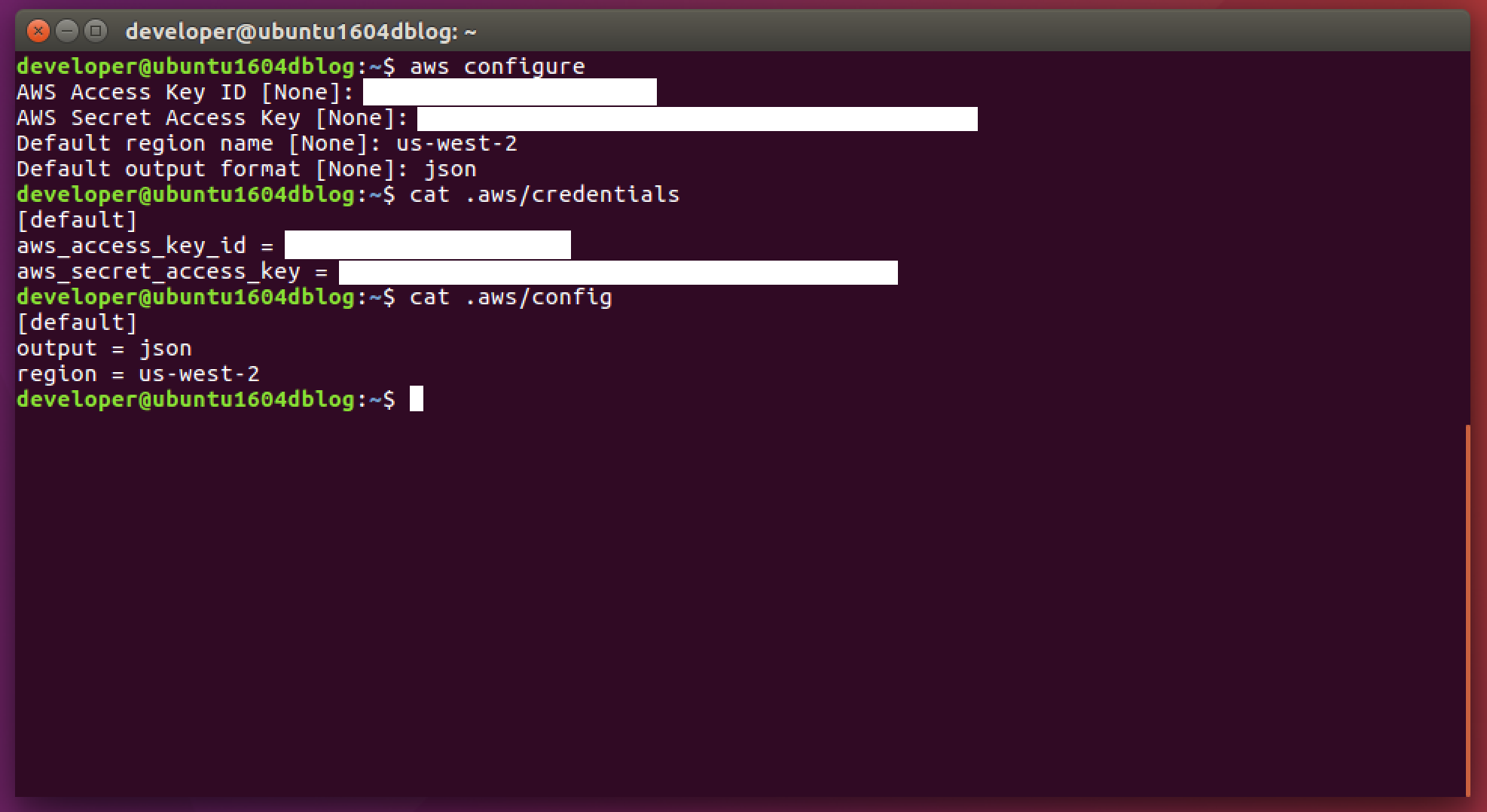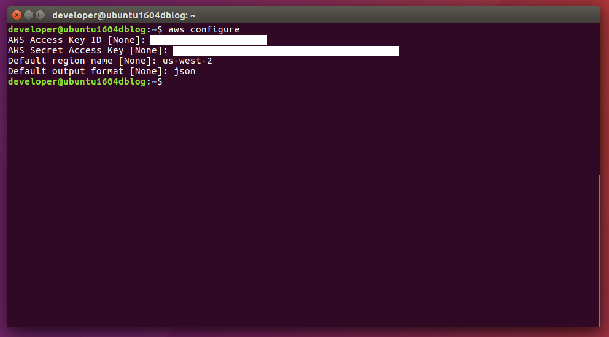 $ aws configure AWS Access Key ID [None]: XXXXXXXXXXXXXXXXXXXX AWS Secret Access Key [None]: XXXXXXXXXXXXXXXXXXXXXXXXXXXXXXXXXXXXXXXX Default region name [None]: us-west-2 Default output format [None]: json