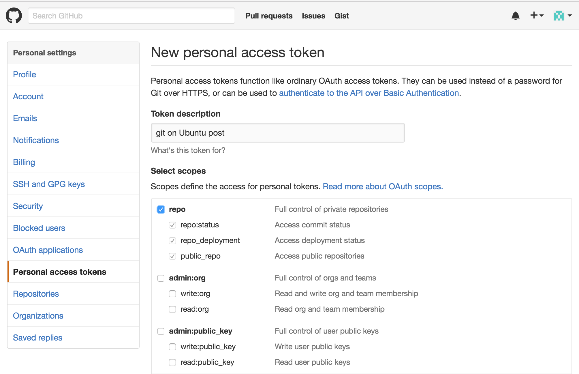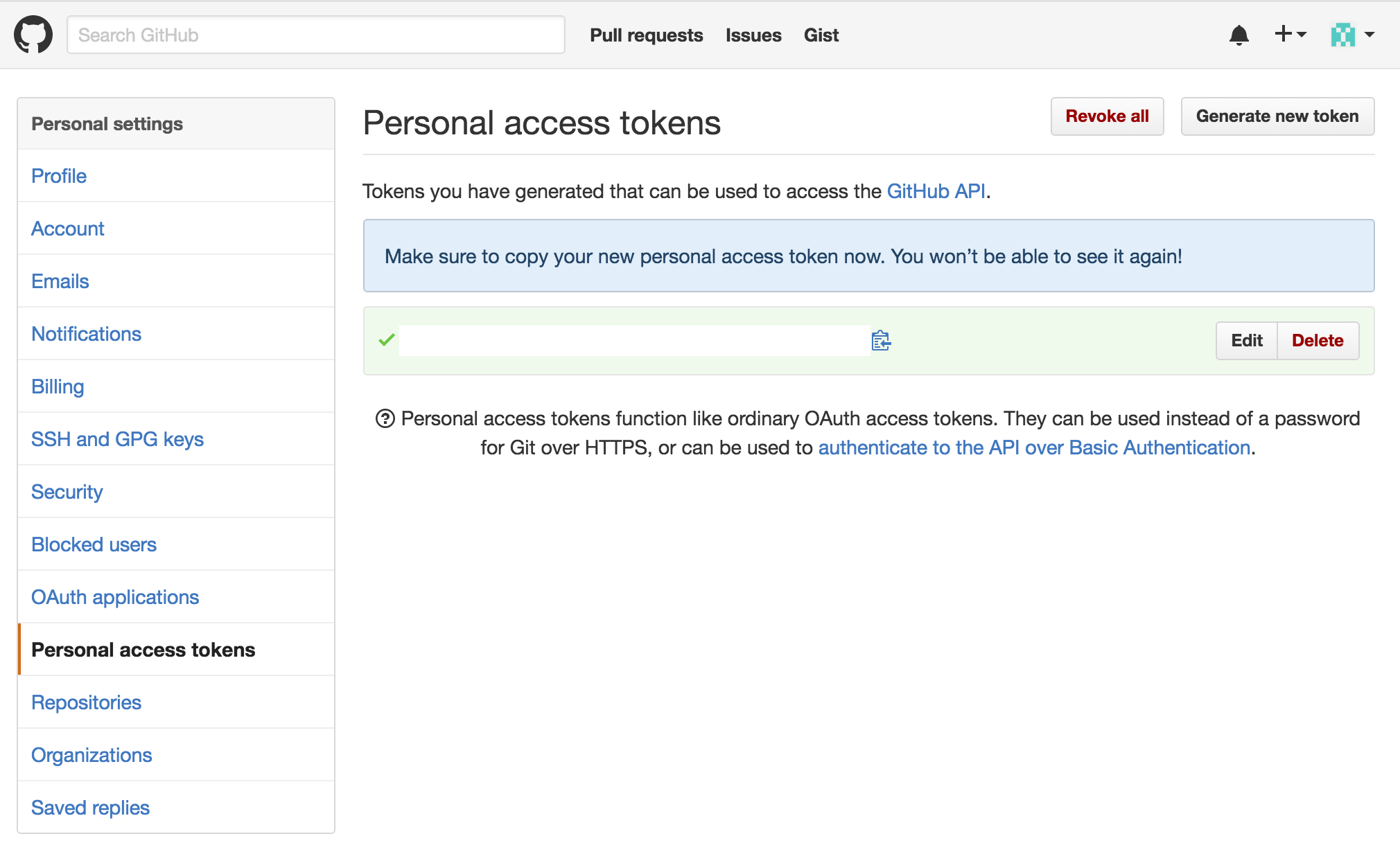 And you will see your newly minted personal access token. Make sure to copy it, since you will not be able to see it on GitHub again.