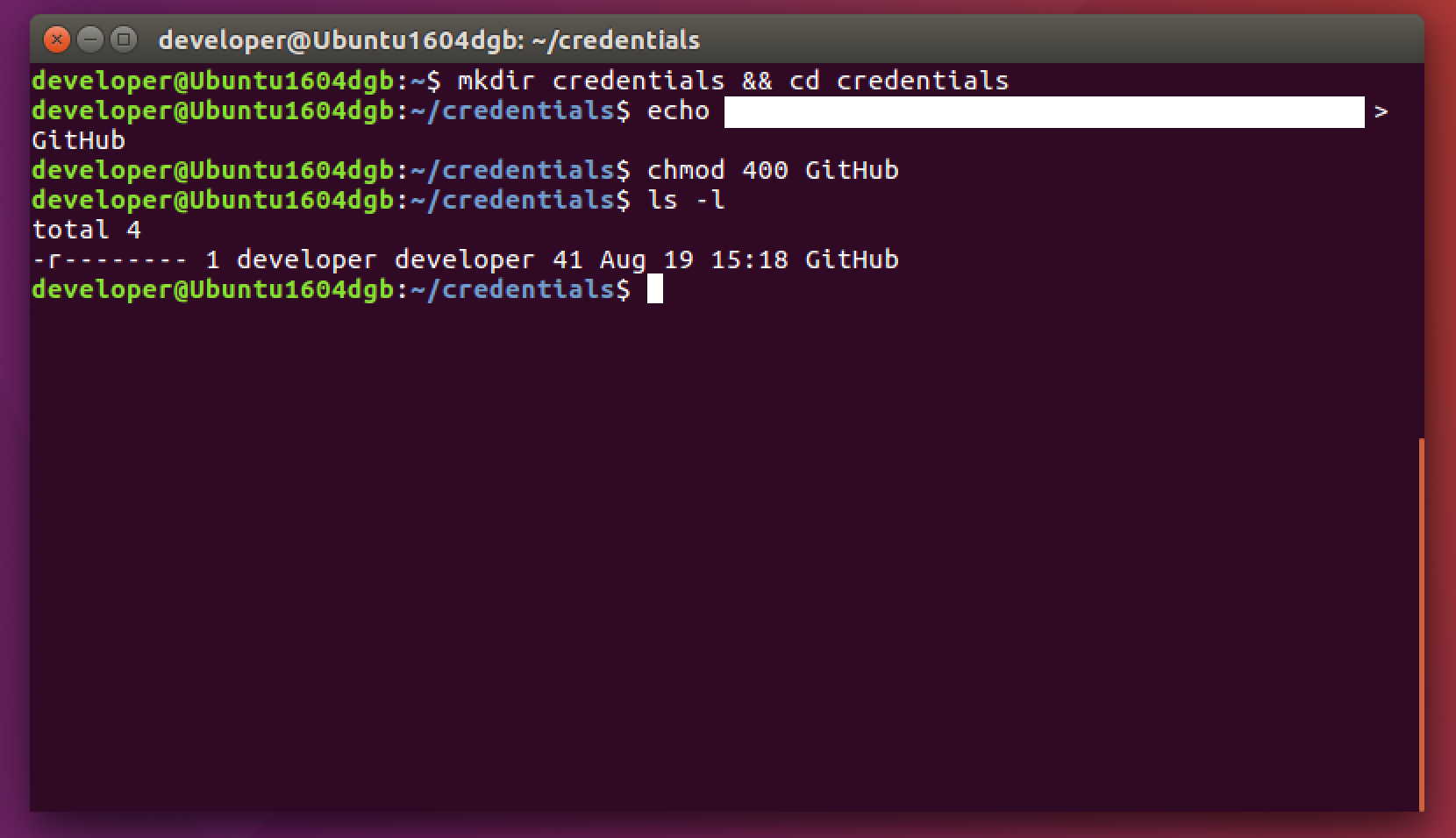 $ mkdir credentials && cd credentials $ echo a4d5this74is7not86a91real708token87haha23df > GitHub $ chmod 400 GitHub $ ls -l