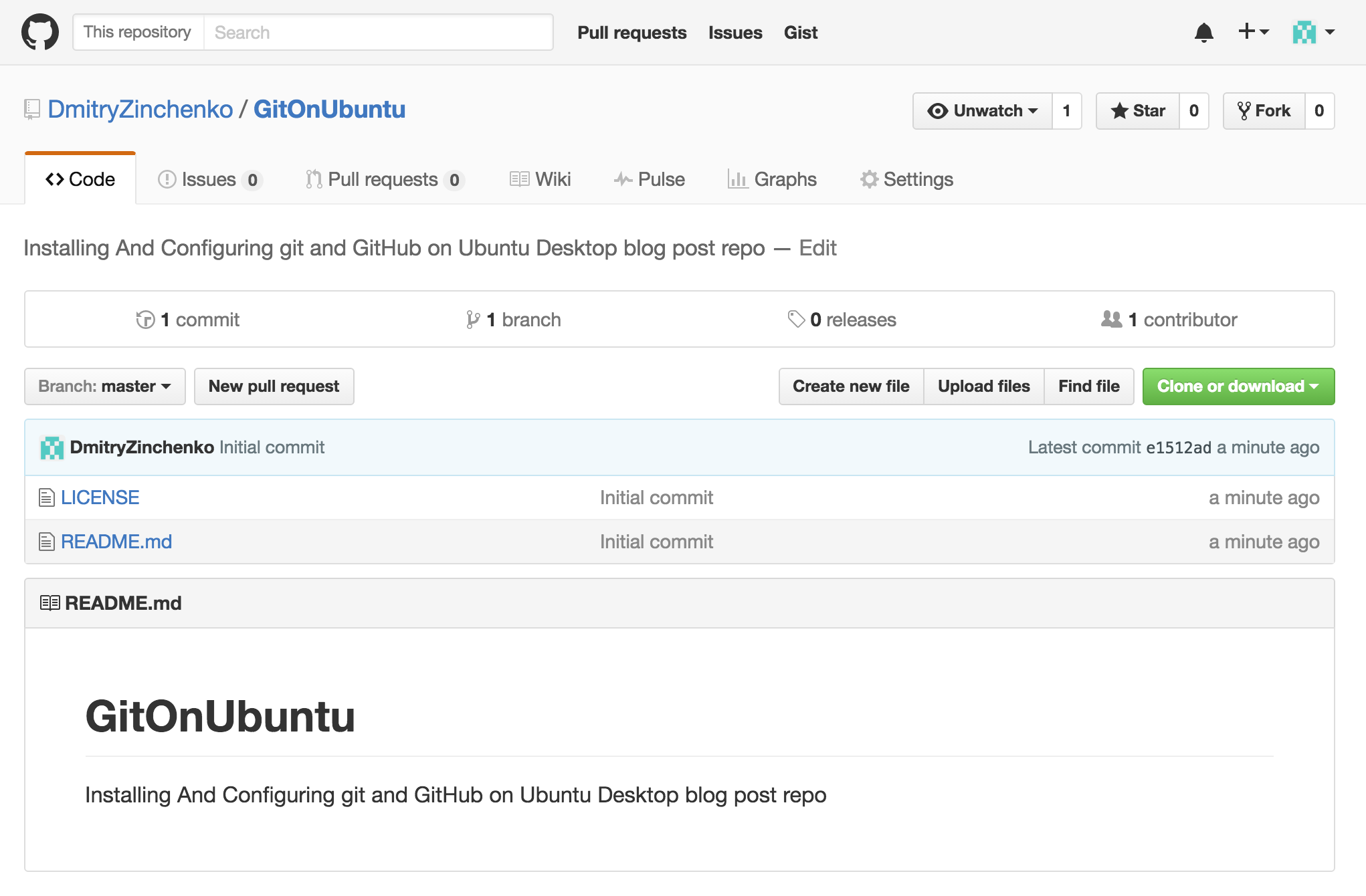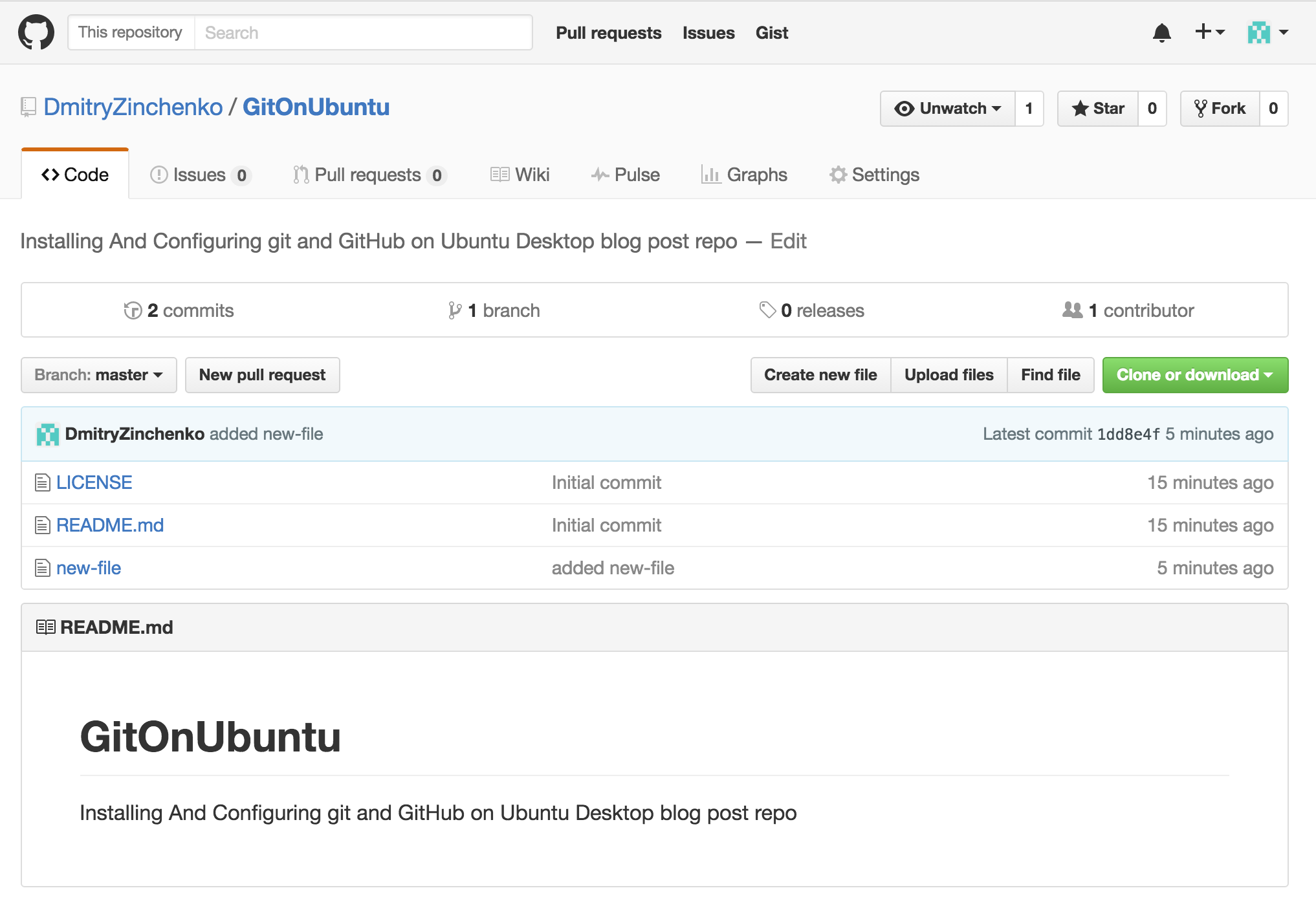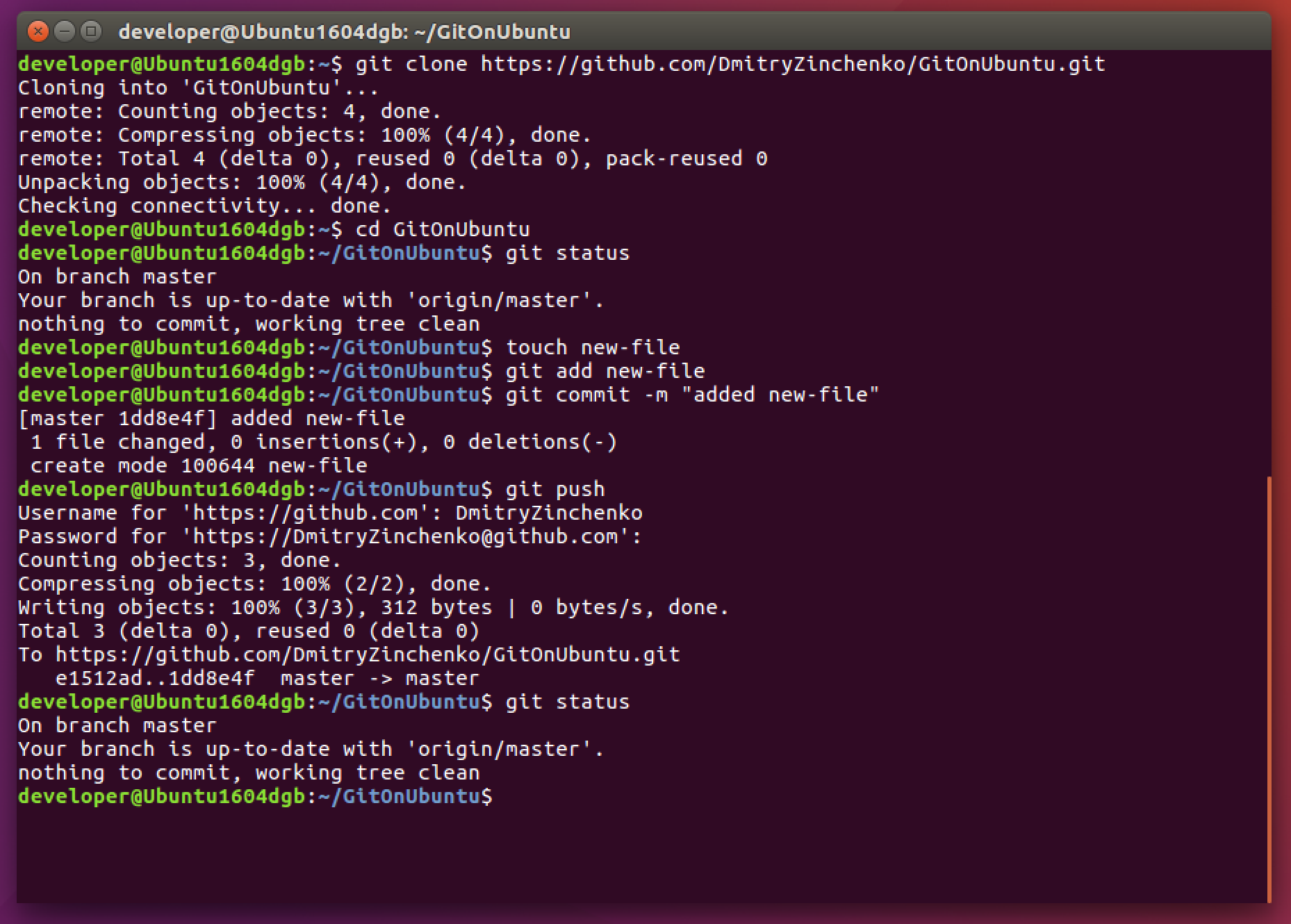 $ git clone https://github.com/DmitryZinchenko/GitOnUbuntu.git $ cd GitOnUbuntu $ git status $ touch new-file $ git add new-file $ git commit -m "added new-file" $ git push $ git status