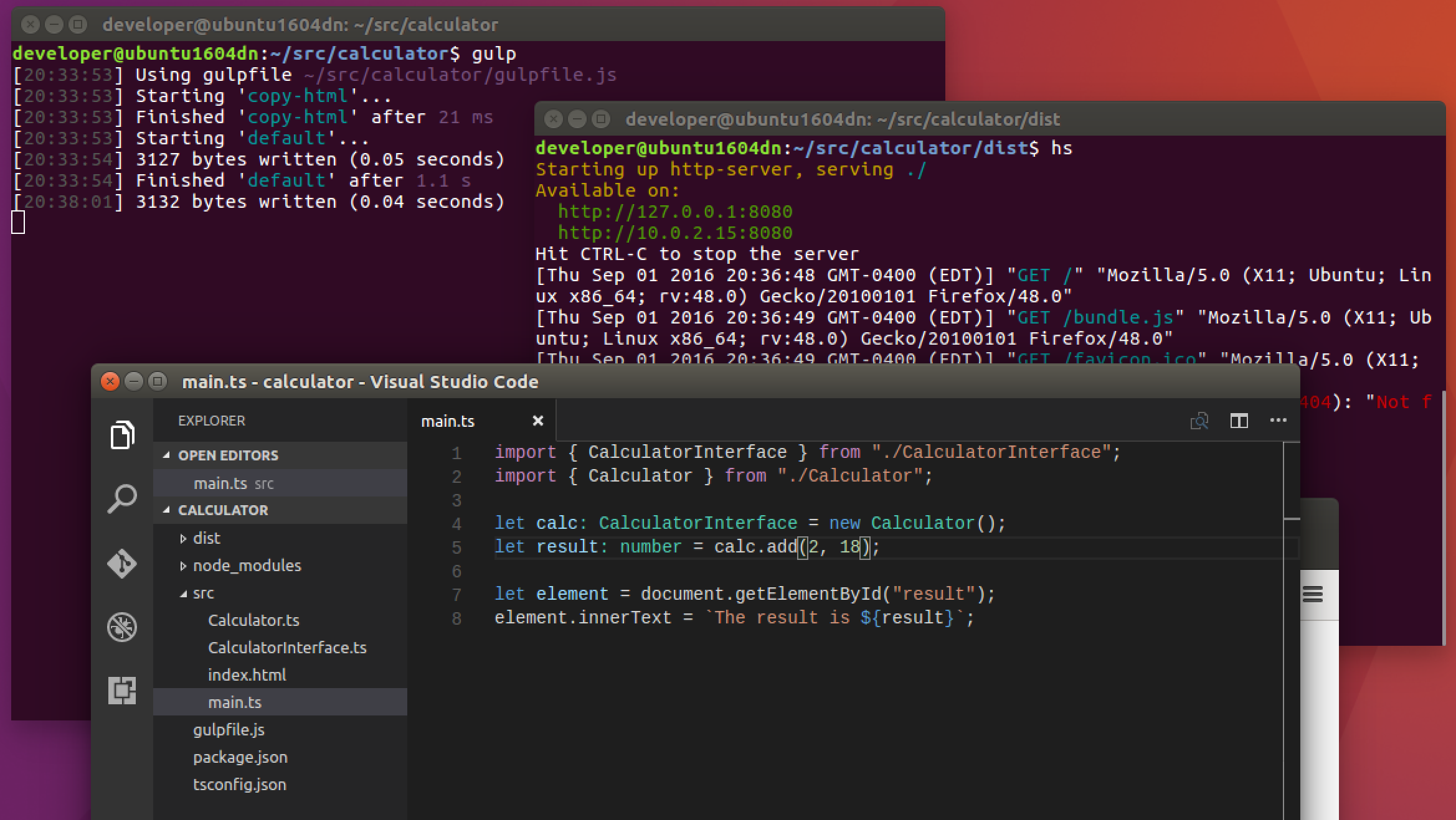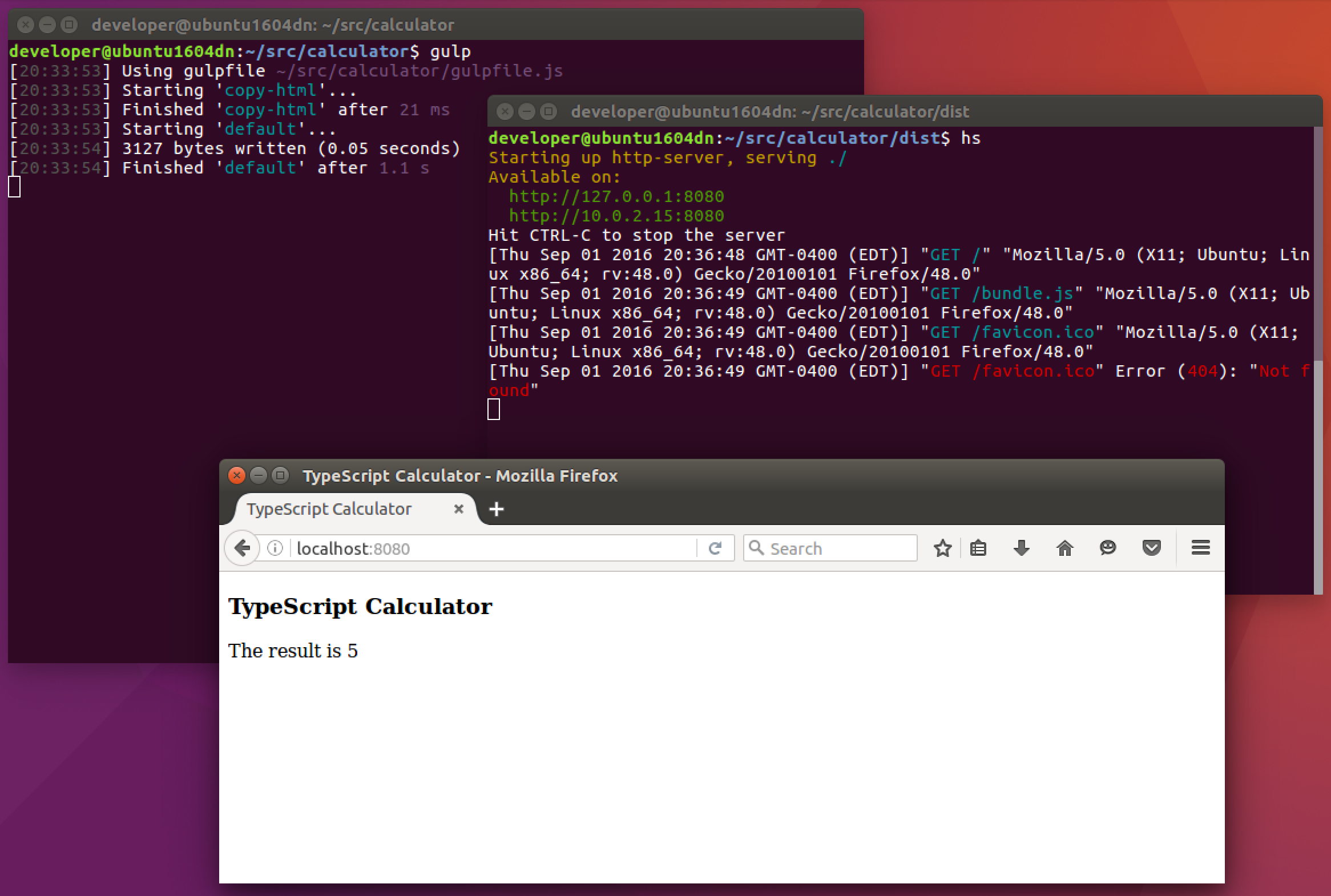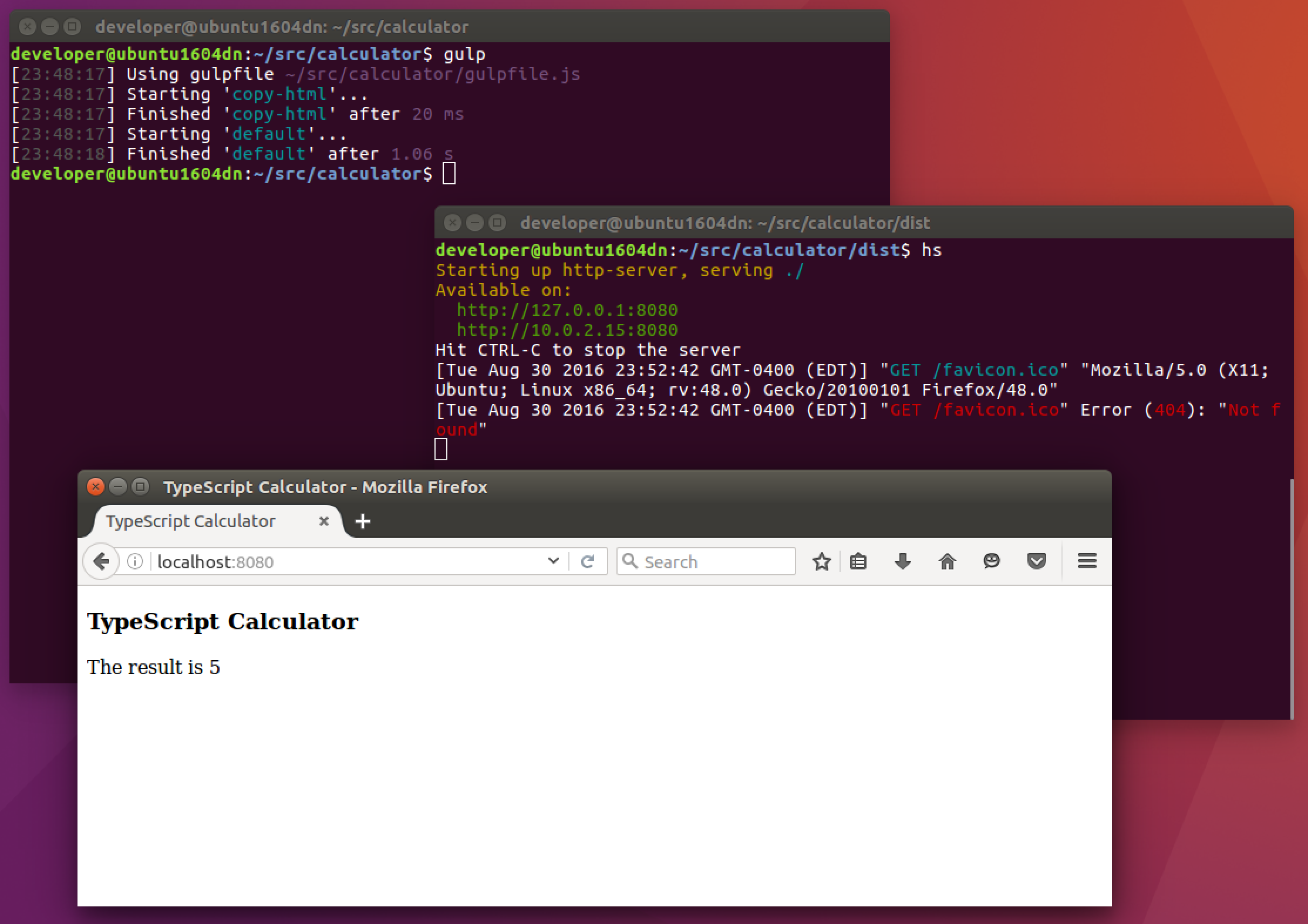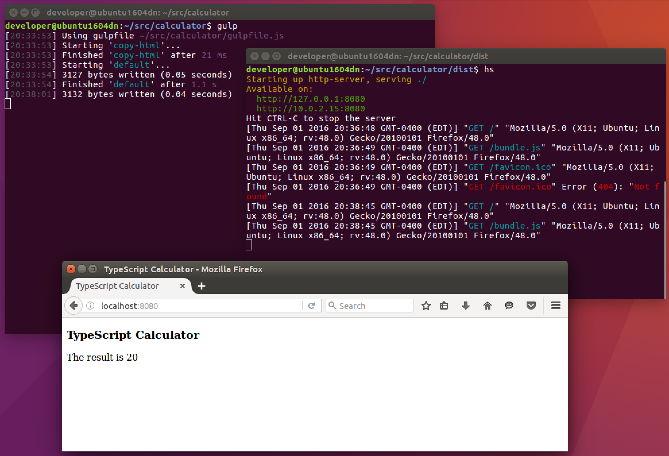 This is the most primitive way to develop web applications using TypeScript. And I’d suspect nobody develops this way. Ideally you should use task runners, like Grunt or Gulp, to automate compilation, bundling and minification at the bare minimum. Let’s look at how Gulp can help us.