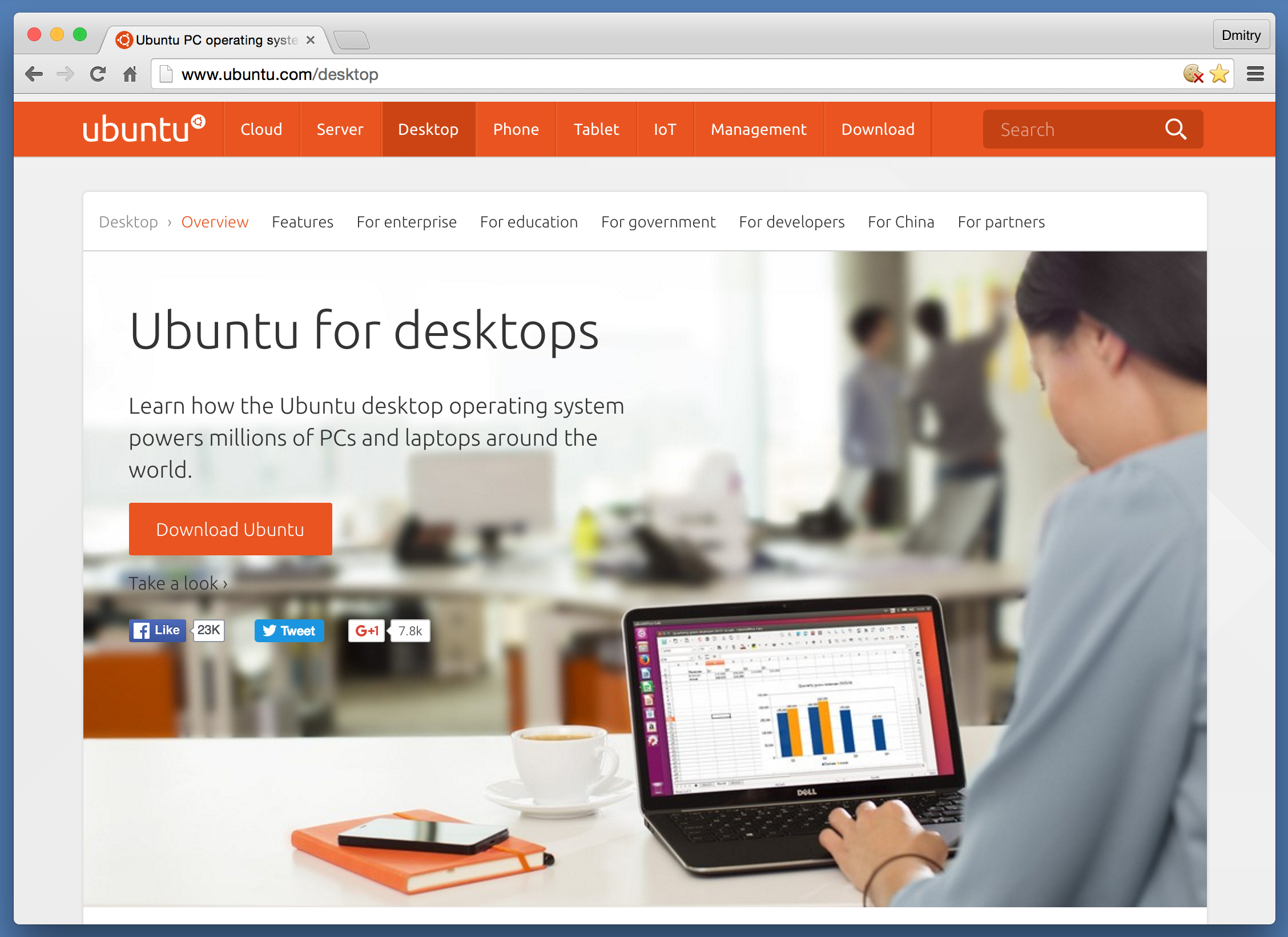 The current version of Ubuntu Desktop at the time of writing is 16.04 LTS. LTS stands for “long term support” which means Canonical, the company behind Ubuntu distribution, will provide feature and security updates for a number of years. You can download Ubuntu Desktop following this link, and choose either 32- or 64-bit PC (AMD) desktop image (I’ve got 64-bit Ubuntu Desktop version 16.04.1).